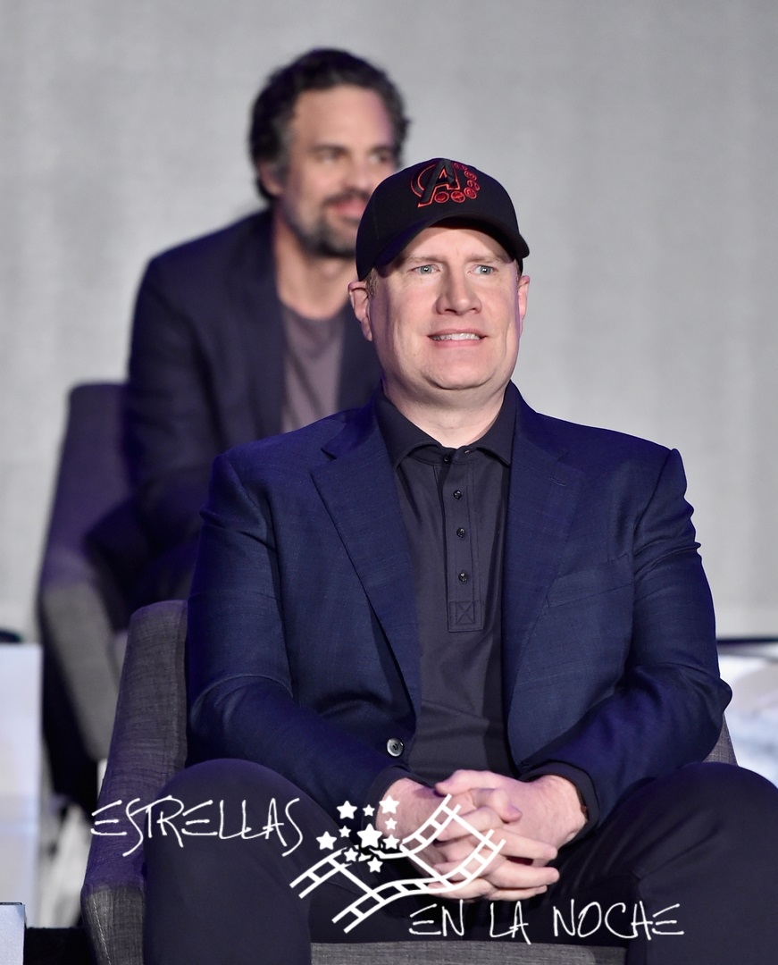 LOS ANGELES, CA - APRIL 07: President of Marvel Studios/Producer Kevin Feige (front) and Mark Ruffalo speak onstage during Marvel Studios' "Avengers: Endgame" Global Junket Press Conference at the InterContinental Los Angeles Downtown on April 7, 2019 in Los Angeles, California. (Photo by Alberto E. Rodriguez/Getty Images for Disney)