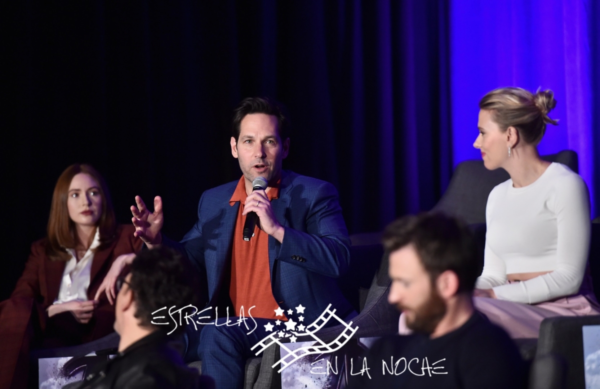 LOS ANGELES, CA - APRIL 07: (L-R) Karen Gillan, Paul Rudd and Scarlett Johansson speak onstage during Marvel Studios' "Avengers: Endgame" Global Junket Press Conference at the InterContinental Los Angeles Downtown on April 7, 2019 in Los Angeles, California. (Photo by Alberto E. Rodriguez/Getty Images for Disney)