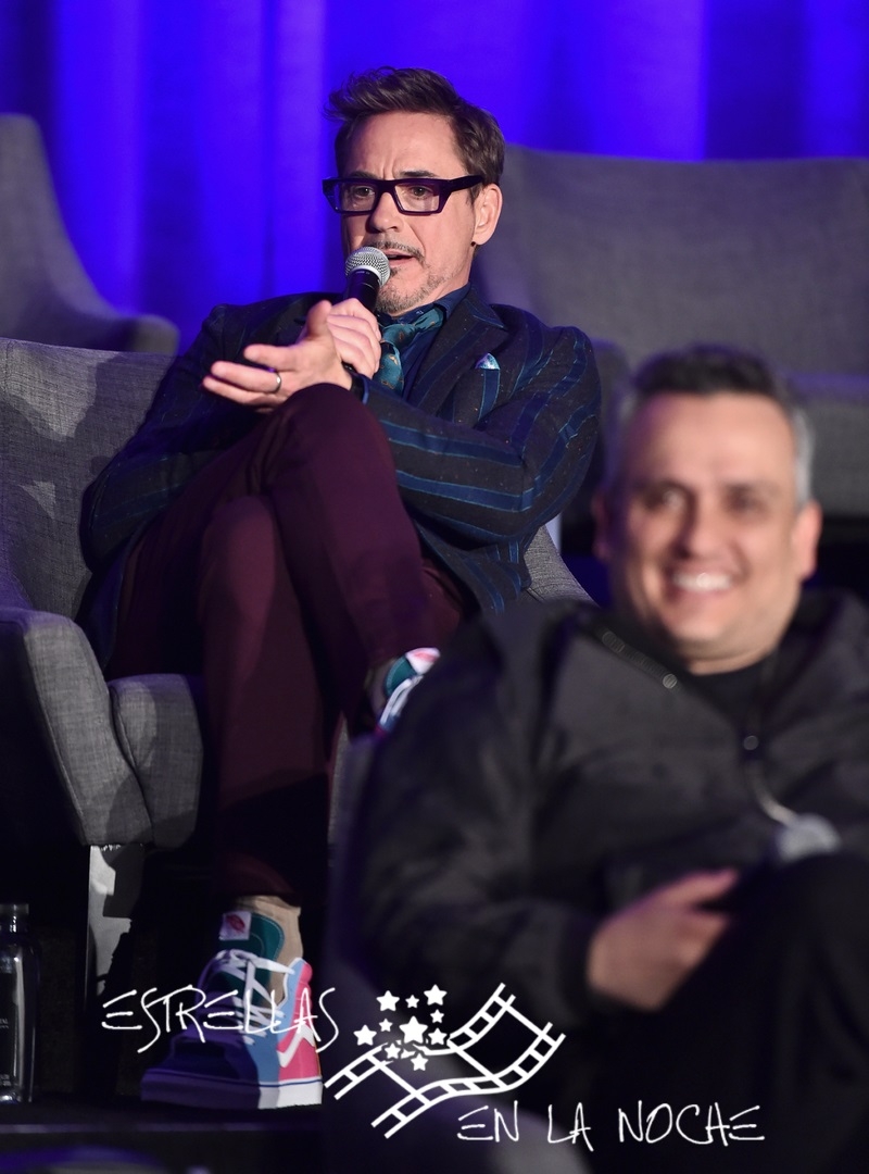 LOS ANGELES, CA - APRIL 07: Robert Downey Jr. (back) and Director Joe Russo speak onstage during Marvel Studios' "Avengers: Endgame" Global Junket Press Conference at the InterContinental Los Angeles Downtown on April 7, 2019 in Los Angeles, California. (Photo by Alberto E. Rodriguez/Getty Images for Disney)